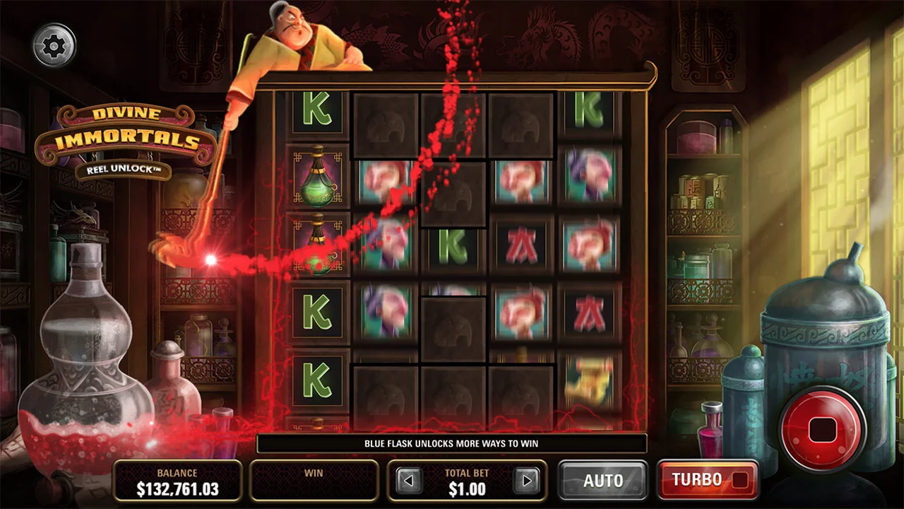 The Great Alchemist has spent his life creating The Elixir of Eternal Youth. When his magical staff turns red, the three highest paying hags morph into a beautiful geisha and share wins. As well as the above, this 5x5 video slot has 3,125 ways to win and features the innovative Reel Unlock™ mechanic and Free Spins.