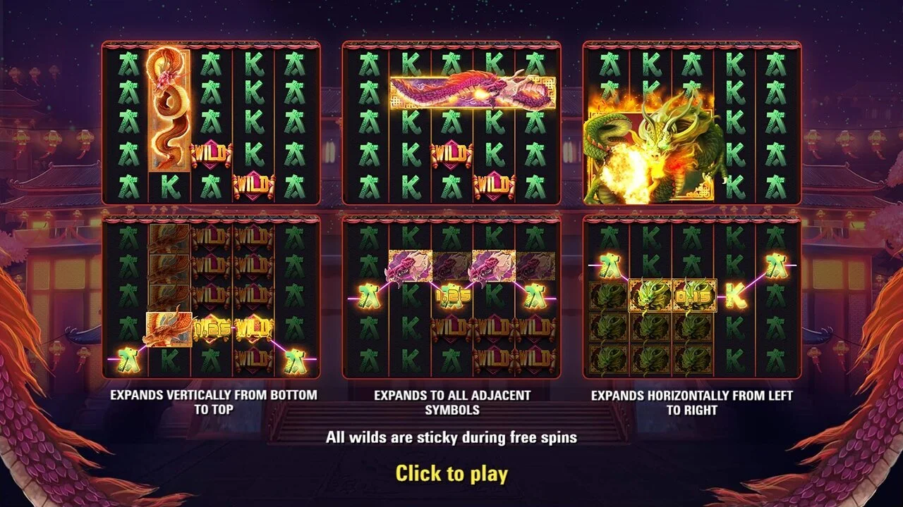 Purple Dragon Wilds expand vertically from bottom to top, Gold Dragon Wilds expand horizontally from left to right, Green Dragon Wilds expand to all adjacent symbols.